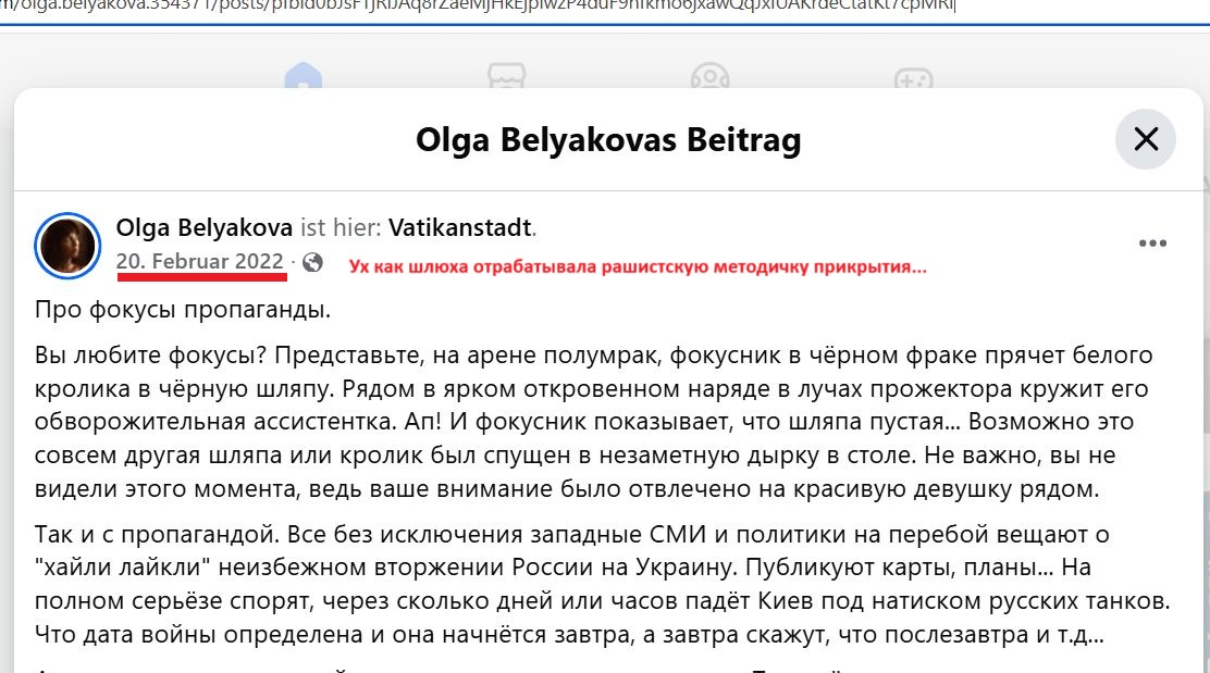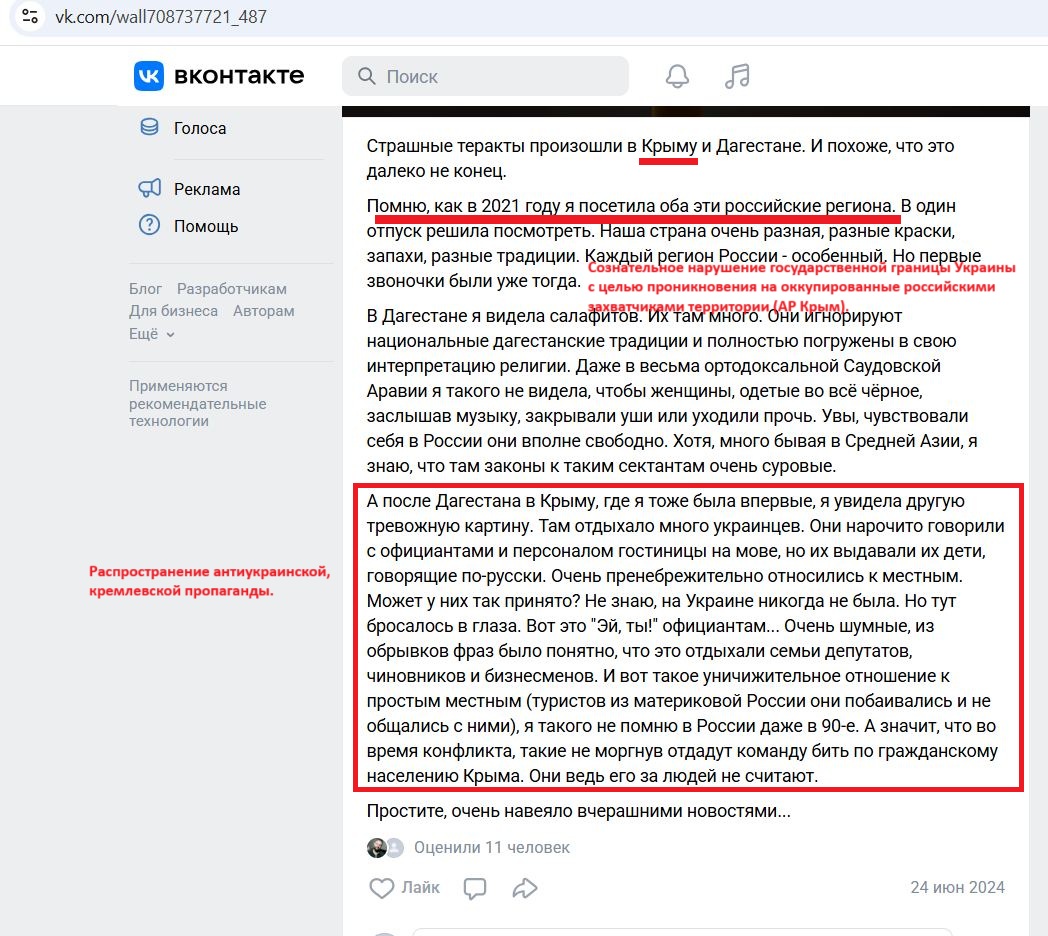 https://www.facebook.com/olga.belyakova.354371/posts/pfbid097s2bbBKmJUfQmfEmkVoFitKtL8Y7PCYVektcNdX4DpeYAwS4gyGeYG9xf4imt62l Сознательное нарушение государственной границы Украины с целью проникновения на оккупированные российскими захватчиками территории (АР Крым).