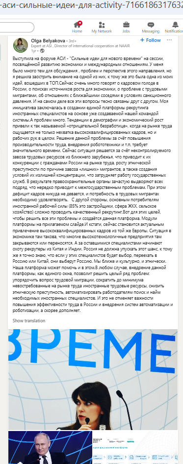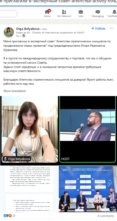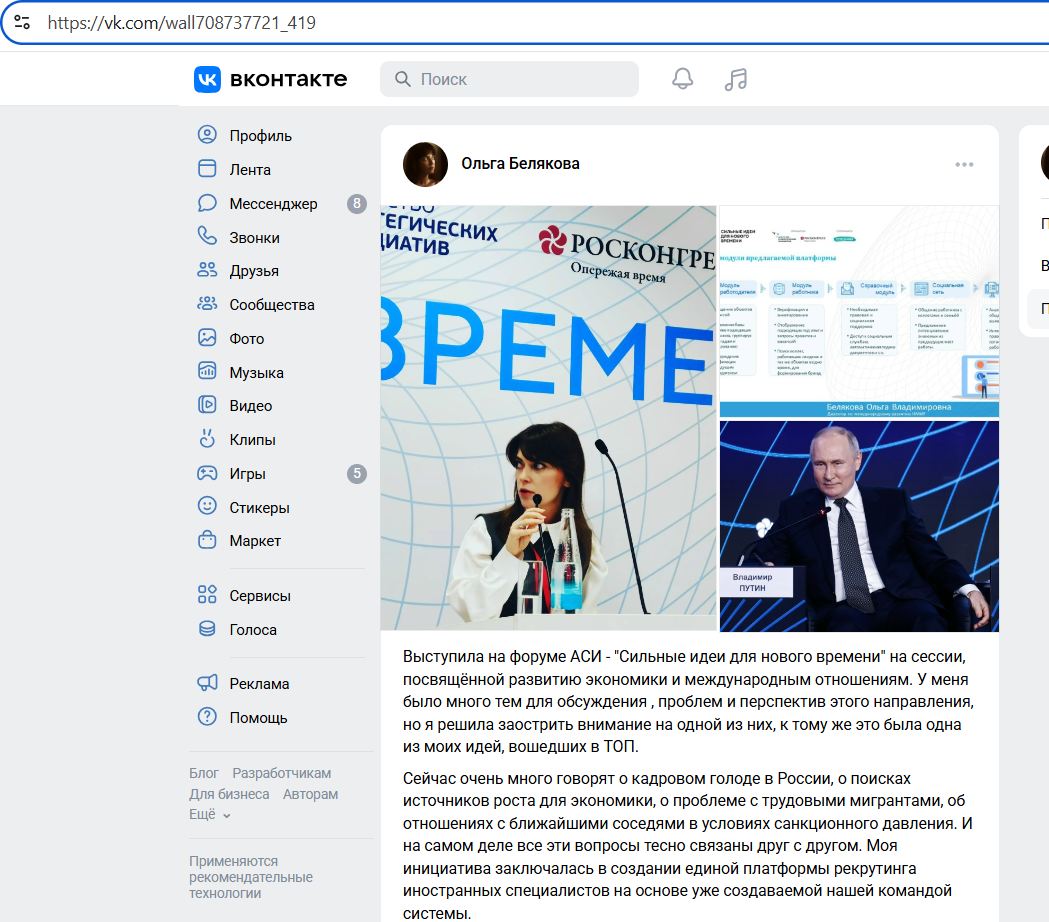 Since 2022 she worked for the Agency for Strategic Initiatives (ASI), which operates under the guidance of the ruZZian "government", with its Supervisory Board headed by "president" vladimir putler.