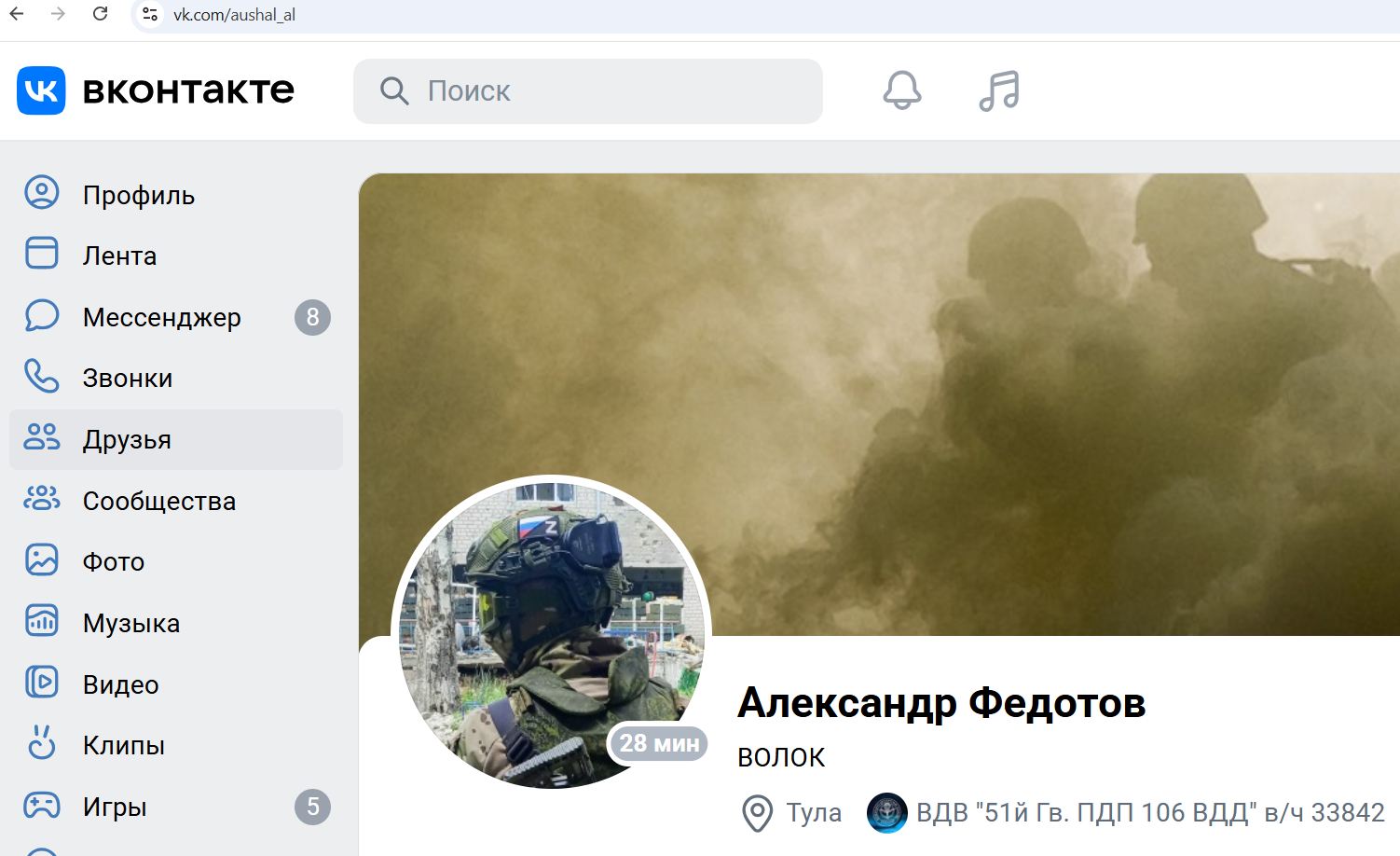 Судя по постам в соц-сетях, является участником полномасштабного вторжения террораши в Украину в составе бандформирования "51й Гв. ПДП 106 ВДД" (в/ч 33842).