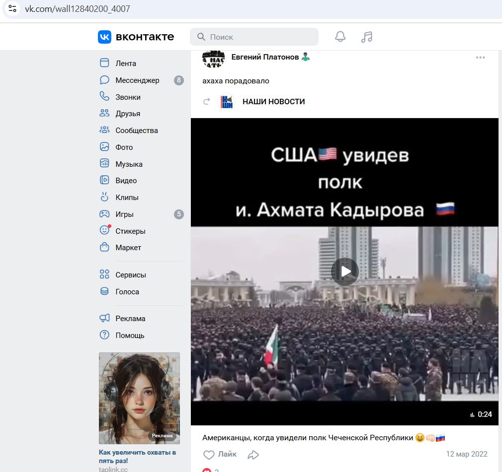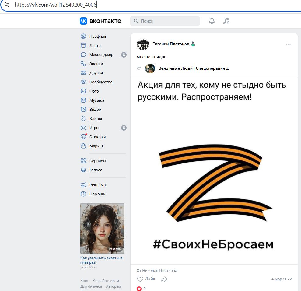 Судя по постам в соц-сетях, может являться соучастником полномасштабного вторжения террораши в Украину.