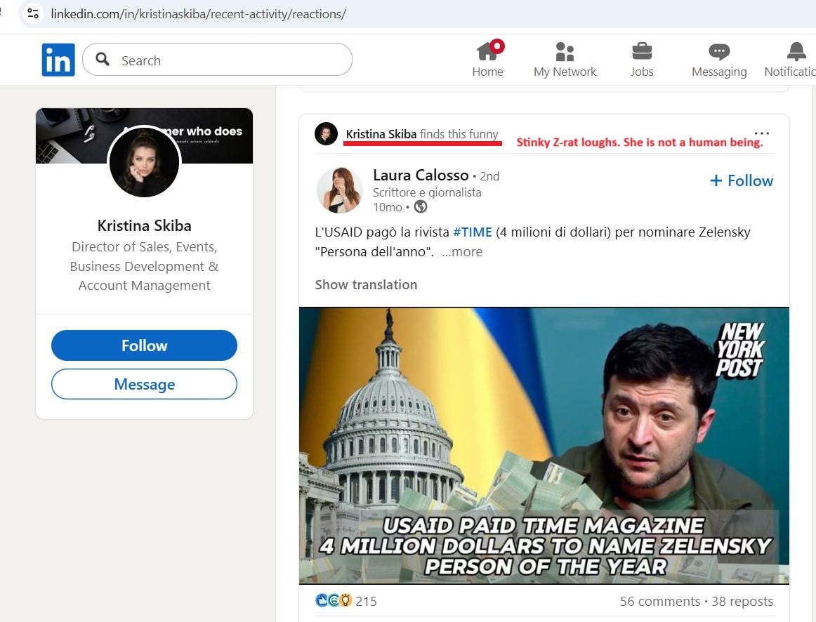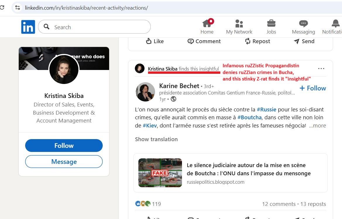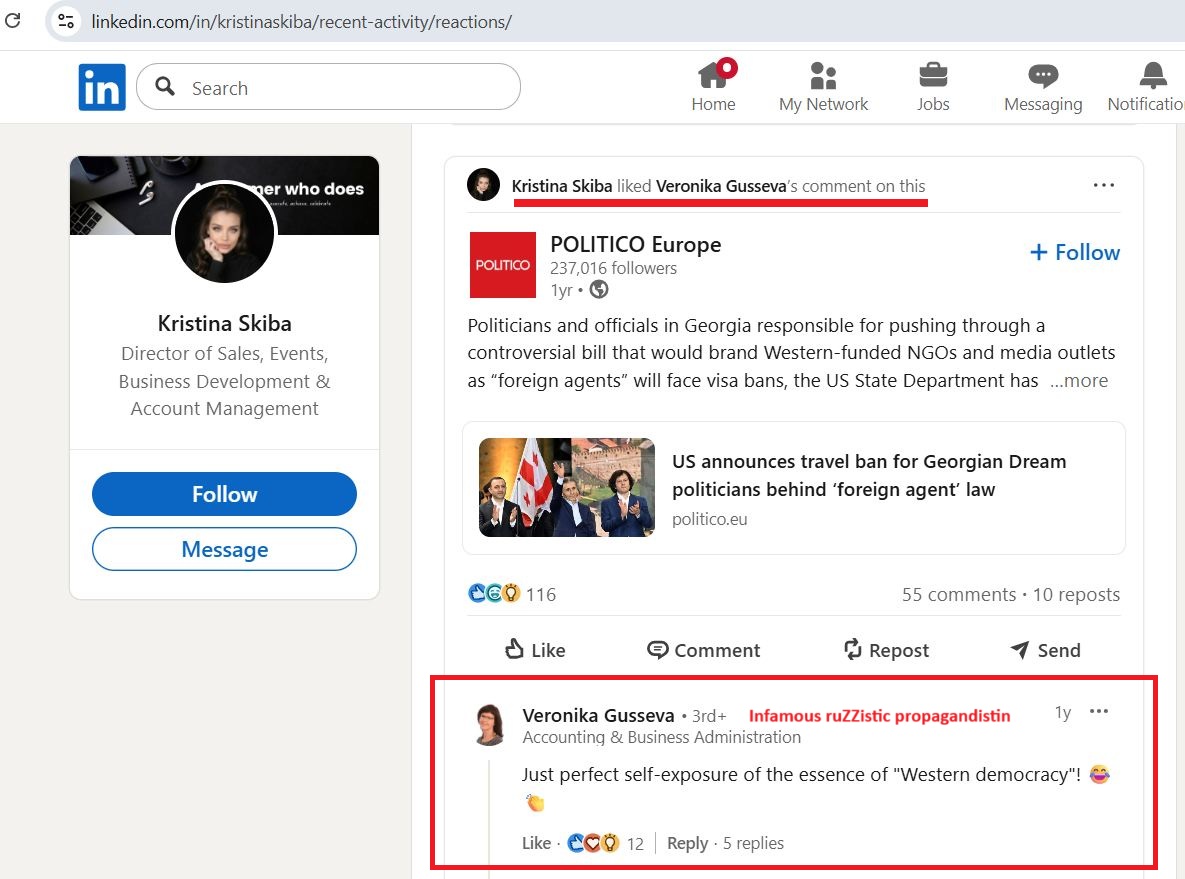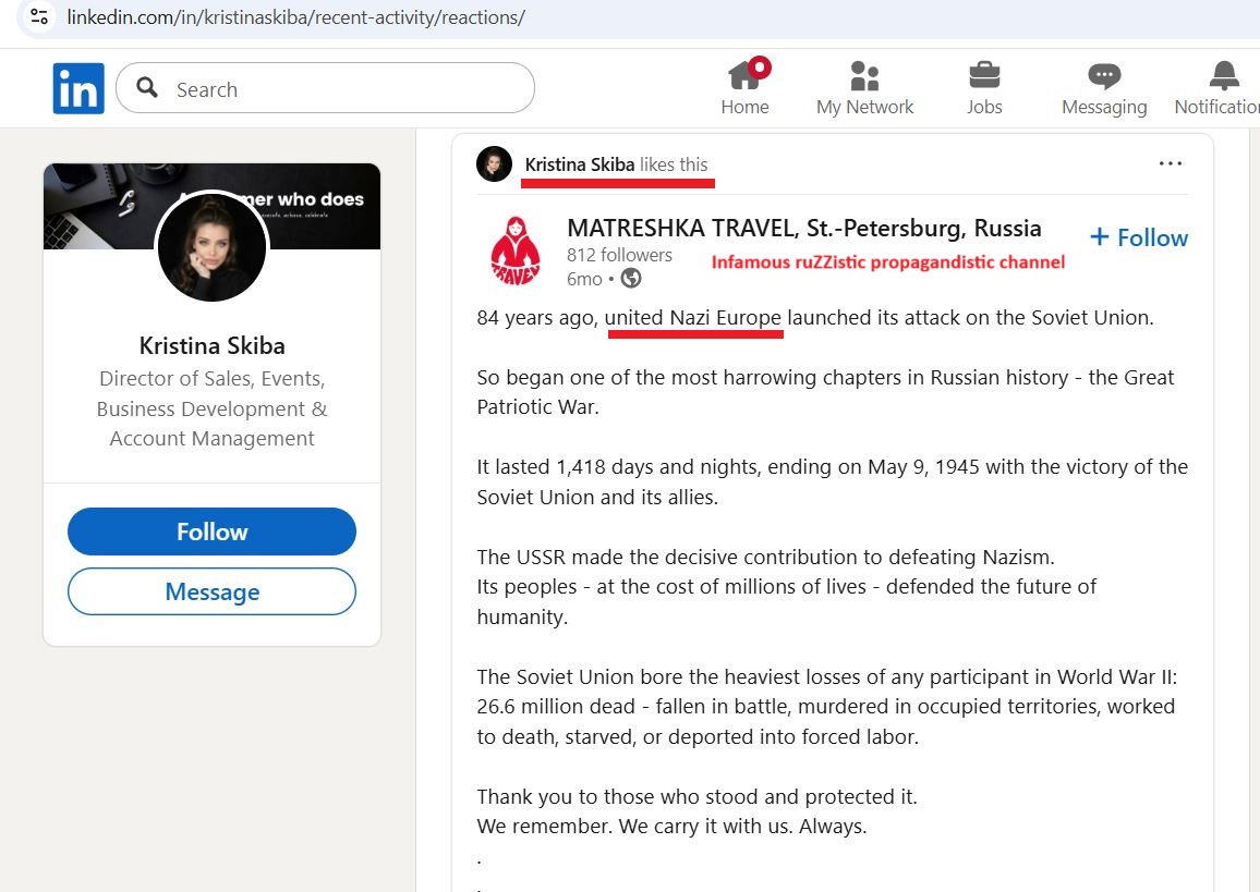 She pretends to be "antifascistic", but in the reality supports terroruZZia and likes all possible ruZZian propaganda.